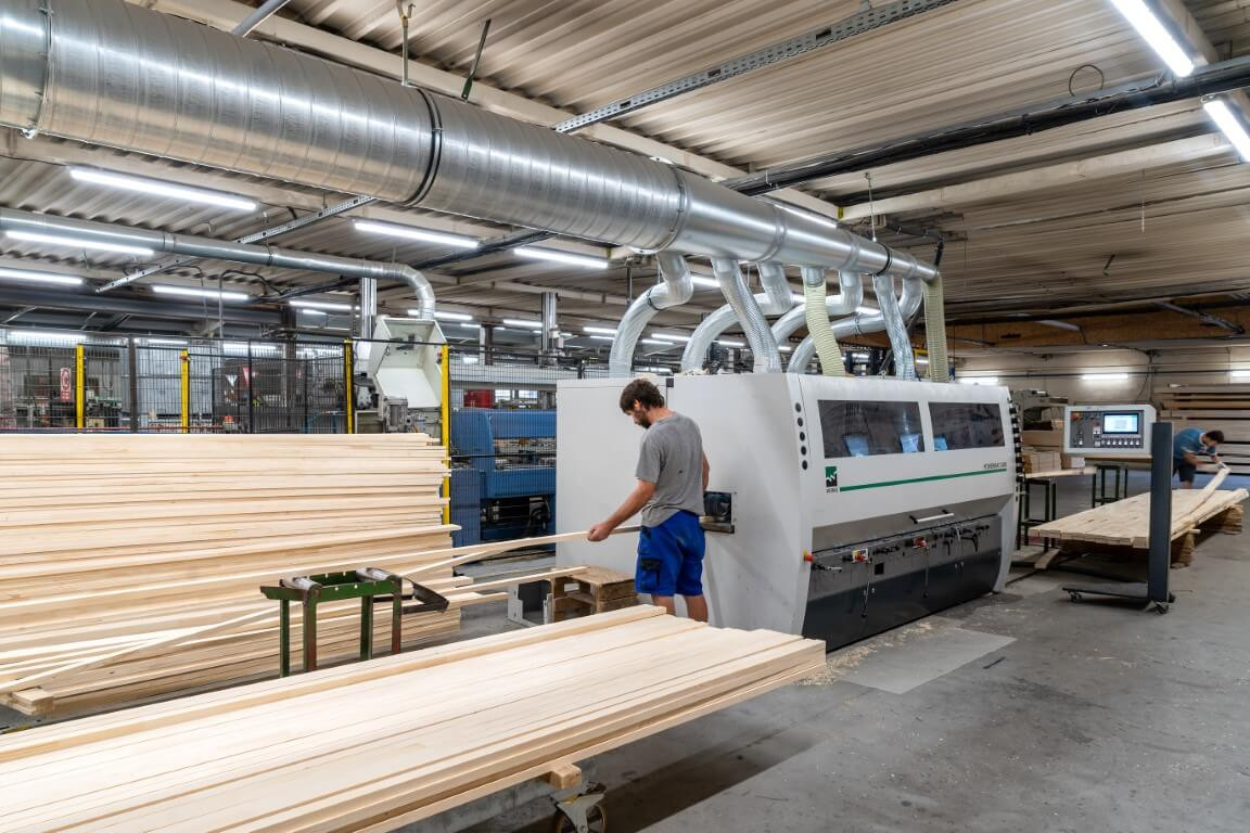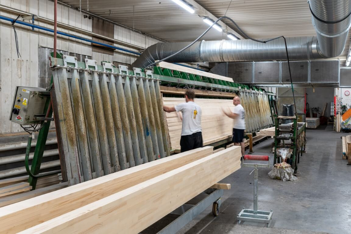 Before entry into the optimization line, we measure the moisture content of every board using an automatic measuring system and discard any non-compliant material. No moist or overdried material leaves our plant.